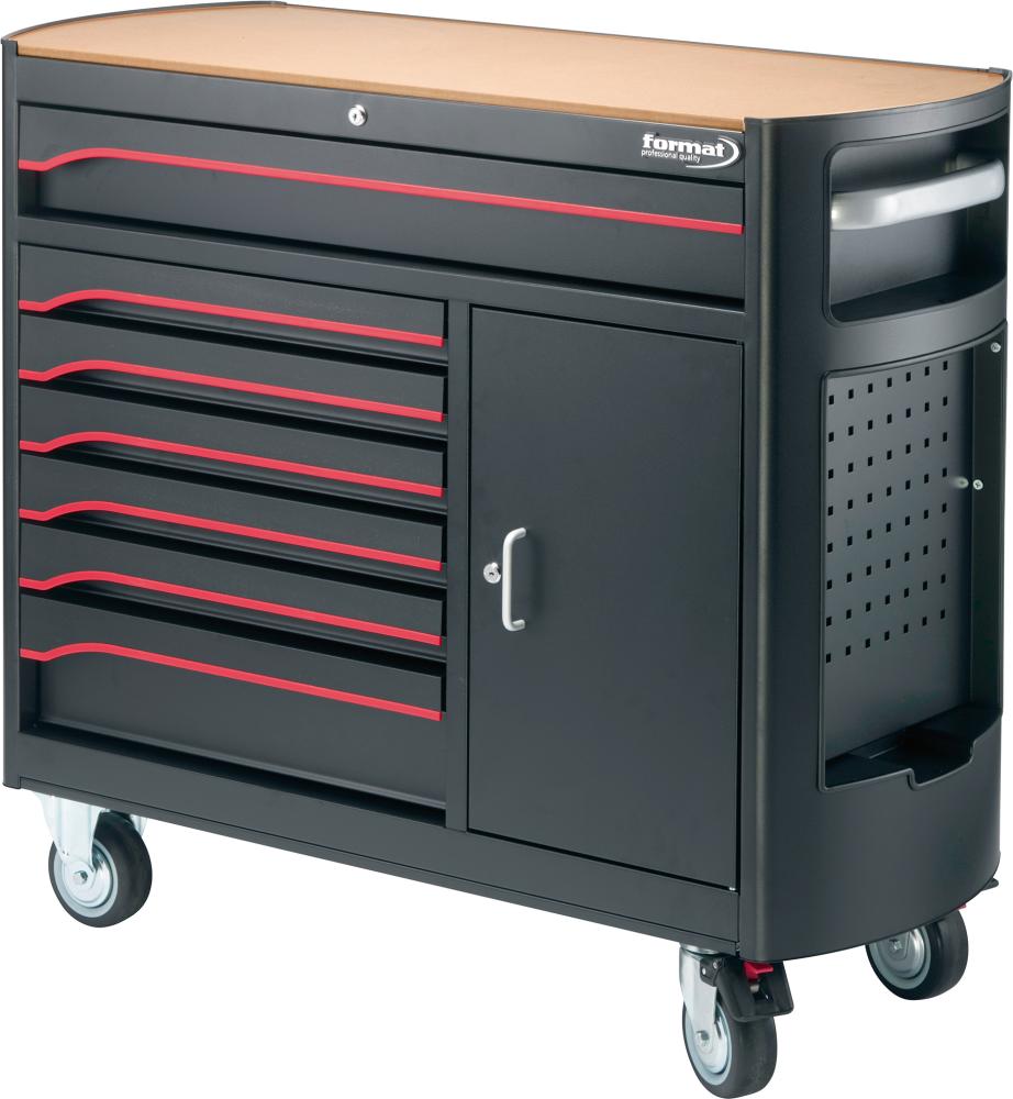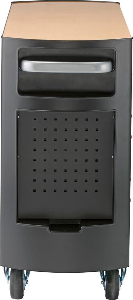 Конструкція: Стабільна конструкція з листової сталі, висувні шухляди (всі окремо розділені) з повним висуванням, індивідуальний запобіжник від ненавмисного відкривання під час руху та напрямні рейки з кульковими підшипниками. Квадратні отвори з обох боків (9 × 9 мм) для кріплення різних аксесуарів. Центральне замикання з циліндричним замком. 2 гумові колеса зсередини, а також 2 керовані гумові поворотні ролики з гальмом (повна зупинка). Всі колеса мають кулькові підшипники для оптимального комфорту під час руху. Поверхня з порошковим покриттям. З 6 висувними висувними шухлядами з одного боку (5 × 75 мм заввишки (підходить для трьох 1/3 модулів); ​​1 × 150 мм заввишки (підходить для трьох 1/3 модулів)), 1 надзвичайно широка шухляда (940 × 397 × 120 мм (підходить для п’яти 1/3 модулів)). За дверцятами, що замикаються, знаходиться велика полиця, яку можна розділити вставною полицею. Стільниця з МДФ товщиною 9 мм.