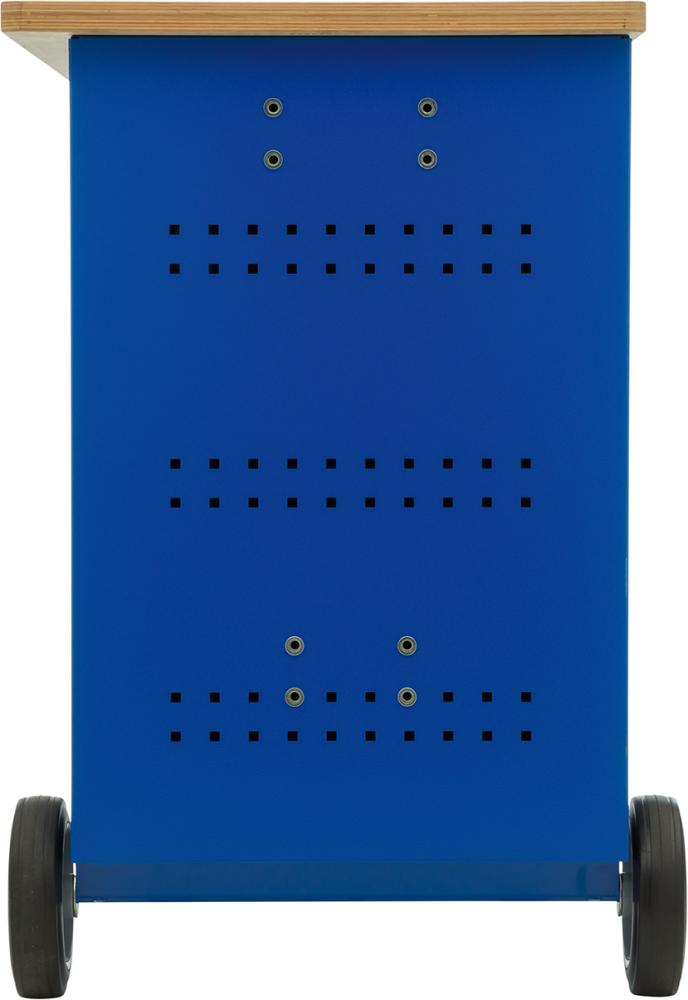 Vyhotovenie: Pevná oceľová plechová konštrukcia so 6 jednostranne výsuvnými, odnímateľnými zásuvkami (4 x 75; 2 x 155 mm vysoké), s guľôčkovými vodiacimi lištami a individuálnym zámkom výsuvu, zabraňuje otvoreniu viac ako jednej zásuvky. Ľahké ovládanie vďaka riadiacej a vodiacej rukoväti a špeciálnej konštrukcii nápravy GEDORE. Štvorhranné otvory na oboch stranách (10 × 38 mm) na pripevnenie rôzneho príslušenstva. Centrálne uzamykateľný pomocou cylindrického zámku. Pracovná doska z bukovej preglejky multiplex s hrúbkou 30 mm. Povrch je dodatočne chránený fermežou na báze ľanového oleja. Pracovná doska je posunutá dozadu, čo umožňuje pripevniť pracovný stôl na kolieskach priamo k stene. Vysoká stabilita vďaka 2 veľkým, bočne vyčnievajúcim vysokovýkonným kolieskam (Ø 200 mm) a 2 otočným kolieskam (Ø 125 mm) s úplnou aretáciou pre pevné státie vo všetkých smeroch. Práškovo lakovaný povrch odolný proti poškriabaniu, korpus, dvierka a zásuvky v modrej farbe GEDORIT.