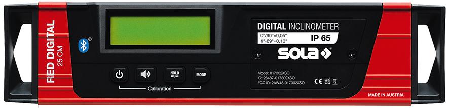 Digitálna vodováha RED DIGITAL Vyhotovenie: Hliníkový pravouhlý profil, práškovo lakovaný. Modul Solatronic na meranie sklonu. Trvalo osvetlený displej sa otáča pri meraní s otočením, zobrazenie v stupňoch, percentách, mm/m a iné. Akustické navádzanie. Trieda ochrany IP65. Integrované rozhranie Bluetooth®. Funkcia Hold a funkcia automatického vypnutia. Presnosť merania libiel: v normálnej polohe a pri otočení 0,5 mm/m. Presnosť merania elektronického modulu: pri 0° a 90°: 0,05°, inak 0,1°. Použitie: Je vhodná na horizontálne a vertikálne merania v normálnej polohe a polohe po otočení, ako aj všeobecne na rôzne sklony. Upozornenie: K dispozícii je bezplatná aplikácia SOLA Measures pre iOS a Android. Hersteller: SOLA-Messwerkzeuge GmbH & Co. KG, Heuriedweg 69, 88131 Lindau (Bodensee), DE, +49838228585, sola@sola.de