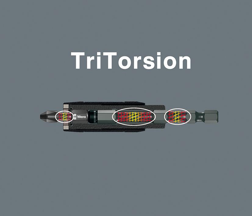 Завдяки двом з’єднаним торсійним зонам, що діють одна за одною, навіть екстремальні піки навантаження, що виникають під час роботи з ударними викрутками, безпечно гасяться, а термін служби біт збільшується.