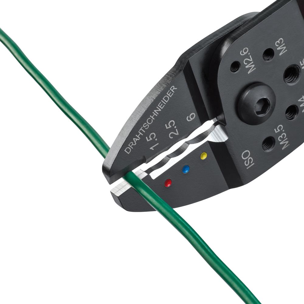Застосування: Для різання, зачистки та обтиску кабелів. З функцією різання для гвинтових шпильок від M2,6 до M5. Виготовлені зі спеціальної сталі, чорне покриття. Для зачистки провідників 0,75–6 мм², а також для обтиску ізольованих кабельних наконечників та кабельних з’єднувачів, а також неізольованих, відкритих штекерних роз’ємів 0,5–6 мм².