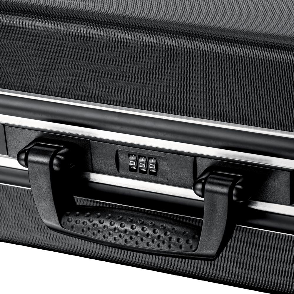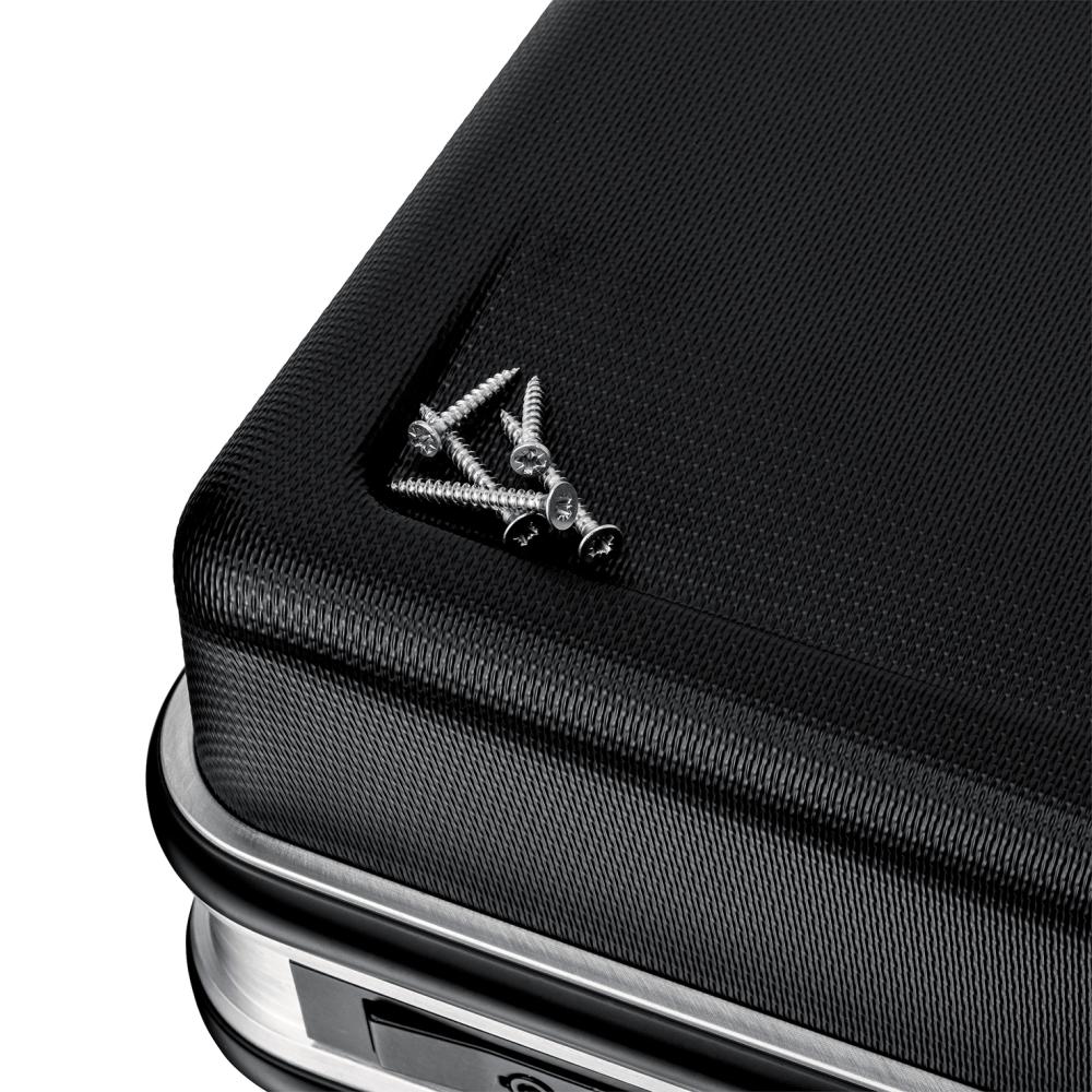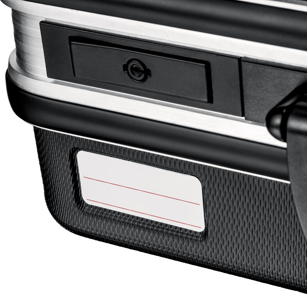 Конструкція: Виготовлений зі зносостійкого та вологостійкого ABS-пластику, чорного кольору, з міцними панелями для інструментів зі спеціального пластику для стійкості до подряпин, стабільності розмірів та стійкості до вологи, жиру та хімікатів, а також з міцною ручкою. Висота основи корпусу 50 мм, можна розділити за бажанням. З оцинкованими металевими петлями, кейс витримує до 15 кг, алюмінієва рама по всьому периметру. Дуже стійкий, з ковзаючими напрямними. Поле для маркування з двома наклейками для індивідуального маркування. Замикається на 2 складні циліндрові замки та 3-значний кодовий замок.