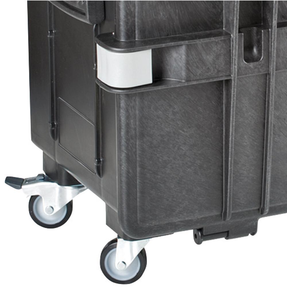 Дизайн: виготовлений з ударостійкого та атмосферостійкого поліпропілену, чорного кольору, з міцними ручками, ергономічною телескопічною ручкою, що застібається, та великими, самозмащувальними, плавно хідними транспортними колесами. Шухляди можна повністю вийняти, але вони також захищені від випадкового випадання. Дуже стійкий, штабелюється та має захисні ніжки. Замикається на 4 складні замки, центральний замок та навісний замок (не входить до комплекту).