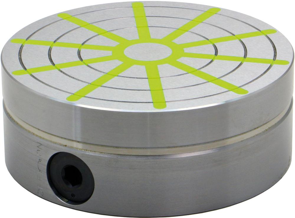 Vyhotovenie: neodýmový magnetický systém s radiálnou a hviezdicovou pólovou vzdiealenosťou. Magnetická sila sa dá plynulo regulovať. Strediace drážky uľahčujú nastavenie obrobku. Do stredu sa môže umiestniť priechodný otvor (Ø C). Priľnavosť: cca 140 N/cm² Výška magnetického poľa: cca 10 mm Opotrebiteľnosť pólovej platne: 3 mm pri Ø 130 mm, 7 mm od Ø 150 mm Použitie: extrémne silné kruhové puzdro, špeciálne koncipované pr krúžky a na tvrdé sústruženie s vysokými otáčkami. Upozornenie: Hĺbky vŕtania pólovej platne, pri nových, neprebrúsených alebo nepresústružených radiálnych pólových puzdrách do Ø 400 mm = 16 mm, od Ø 500–600 = 26 mm.