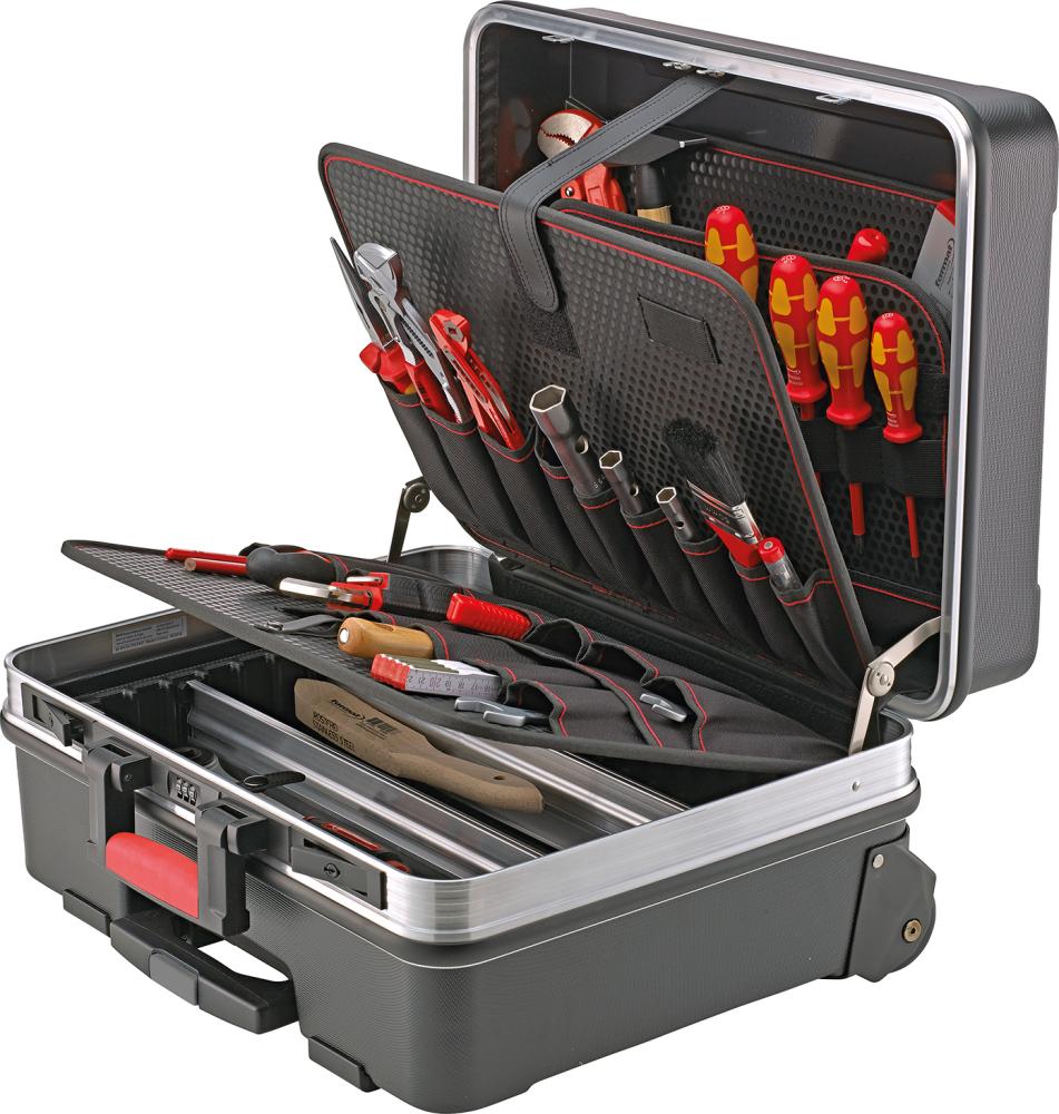 Vyhotovenie: Z ABS plastu odolného proti opotrebeniu a vlhkosti, čiernej farby, s odolnými stenami zo špeciálneho plastu pre odolnosť proti poškriabaniu, rozmerovú stálosť a odolnosť proti vlhkosti, tukom a chemikáliám, ako aj so stabilným 3-násobným teleskopickým výsuvom s práškovým povlakom a inline kolieskami s ľahkých chodom. Výška škrupiny dna 88 mm, možno ľubovoľne deliť. S robustnými, stabilnými závesmi, držiakom bezpečnostného veka, zaťažením kufra do 30 kg, dvojitým hliníkovým rámom s ochranou proti nárazom. Veľmi stabilné a s ochrannými integrovanými podlahovými klzákmi. Uzamykateľné pomocou 2 sklopných cylindrických zámkov a 1 číslicového zámku. Dodávka bez obsahu. Vybavenie: 22 zástrčných priehradiek na dvojstrannej tabuli na náradie 14 zástrčných priehradiek na krycej doske 1 veľká zástrčná priehradka na krycej doske 1 škrupina dna s krycou doskou 7 slučiek na tabuli veka 1 priehradka na dokumenty v tabuli veka