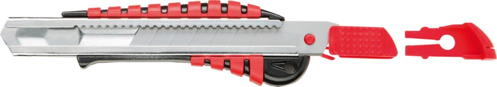Vyhotovenie: Puzdro zo zinkovej tlakovej liatiny s gumovou vložkou, kovovým vedením čepele a zásobníkom čepelí. Fixácia čepele tlačidlom. Dodávka vrátane 1 odlamovacej čepele.