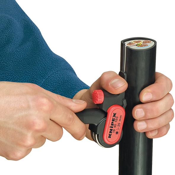 Vyhotovenie: Telo vyrobené z plastu vystuženého sklenenými vláknami. Hĺbku rezu je možné nastaviť pomocou ryhovanej skrutky až do hrúbky izolácie 5 mm. S vymeniteľnou čepeľou, ktorú možno použiť obojstranne. Použitie: Na odplášťovanie kruhových káblov. Odstránenie všetkých vrstiev izolácie. Vhodné na pozdĺžne a obvodové rezanie.