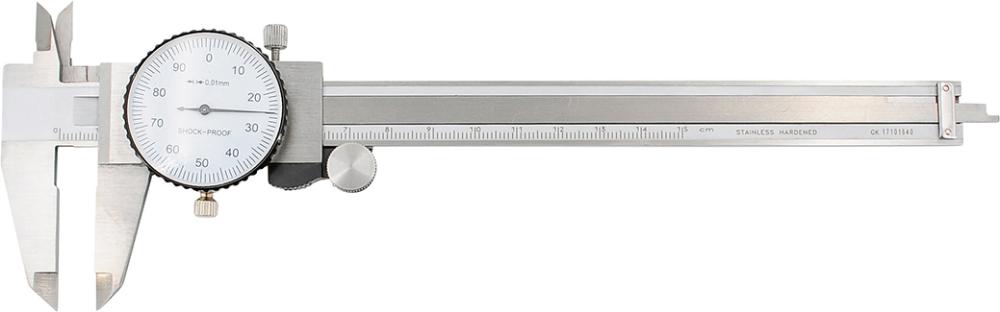 Posuvné meradlo s kruhovým číselníkom Vyhotovenie: Z kalenej nehrdzavejúcej ocele, odčítacie časti matne pochrómované, krytá ozubená tyč, veľmi jemne brúsené meracie plochy, s jemným nastavovaním valčekom, aretačnou skrutkou a obdĺžnikovým hĺbkomerom. Dodáva sa v puzdre z umelej kože. Použitie: Na meranie vnútorných, vonkajších, hĺbkových a stupňovitých rozmerov. Hersteller: Einkaufsbüro Deutscher Eisenhändler GmbH, EDE Platz 1, 42389 Wuppertal, DE, +4920260960, webkontakt@ede.de
