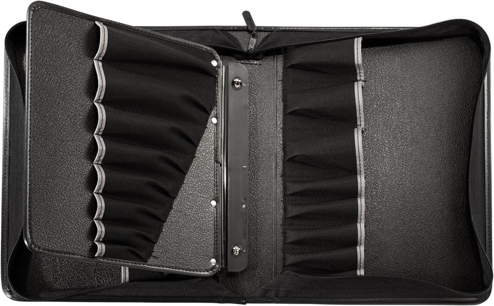 Дизайн: Практичний кейс для інструментів з високоякісної штучної шкіри, чорного кольору, складний, із застібкою-блискавкою по периметру. Оснащений 26 відділеннями та 12 еластичними петлями. Постачається без вмісту.