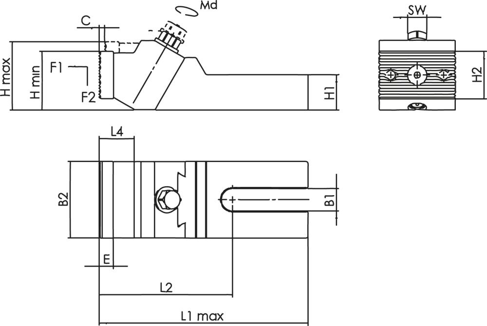 Vyhotovenie: s presným prizmatickým vedením, teleso z temperovanej liatiny, upínacie čeľuste z cementačnej ocele, cementované. Upínacie čeľuste otočné, s hladkou stranou pre obrobené obrobky a ryhovanou stranou pre surové upínacie plochy. Použitie: Vďaka veľkej upínacej ploche sa tieto stabilné upínacie čeľuste hodia na bočné upínanie obrobkov. Na upevnenie stabilných upínacích čeľustí na stole stroja odporúčame použitie dvoch upínacích skrutiek. Upozornenie: Ako upevňovacie skrutky (2 ks na upínaciu čeľusť) sa musia osobitne objednať podľa šírky drážky skrutky pre T-drážky DIN 787.