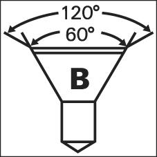 Vyhotovenie: S rádiusom (menšie riziko zlomenia). Ø-Toleranz: ØTolerancia priemeru: Ø 1,25 – 2,5 = +0,14 mm Ø Ø 3,15 – 5 = +0,18 mm Ø Ø 6,3 = +0,22 mm Použitie: Štandardný strediaci vrták na zhotovovanie strediacich otvorov podľa normy DIN 332, list 1, tvar B (s ochranným zapustením 120°).