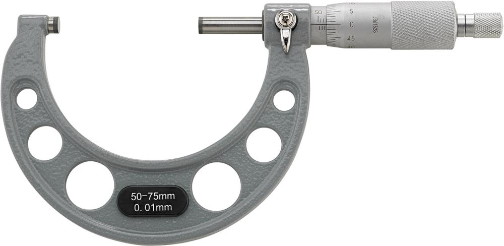 Конструкція: Зчитувальні частини матово-хромовані, вимірювальні поверхні з твердосплавними пластинами, регулювання вимірювального зусилля за допомогою храчкового механізму, з теплоізоляцією для рук, фіксація за допомогою затискного важеля. Поставляється з регулювальним ключем, від діапазону вимірювання 25–50 мм зі шкалою регулювання.