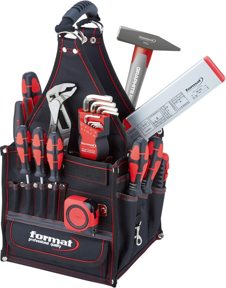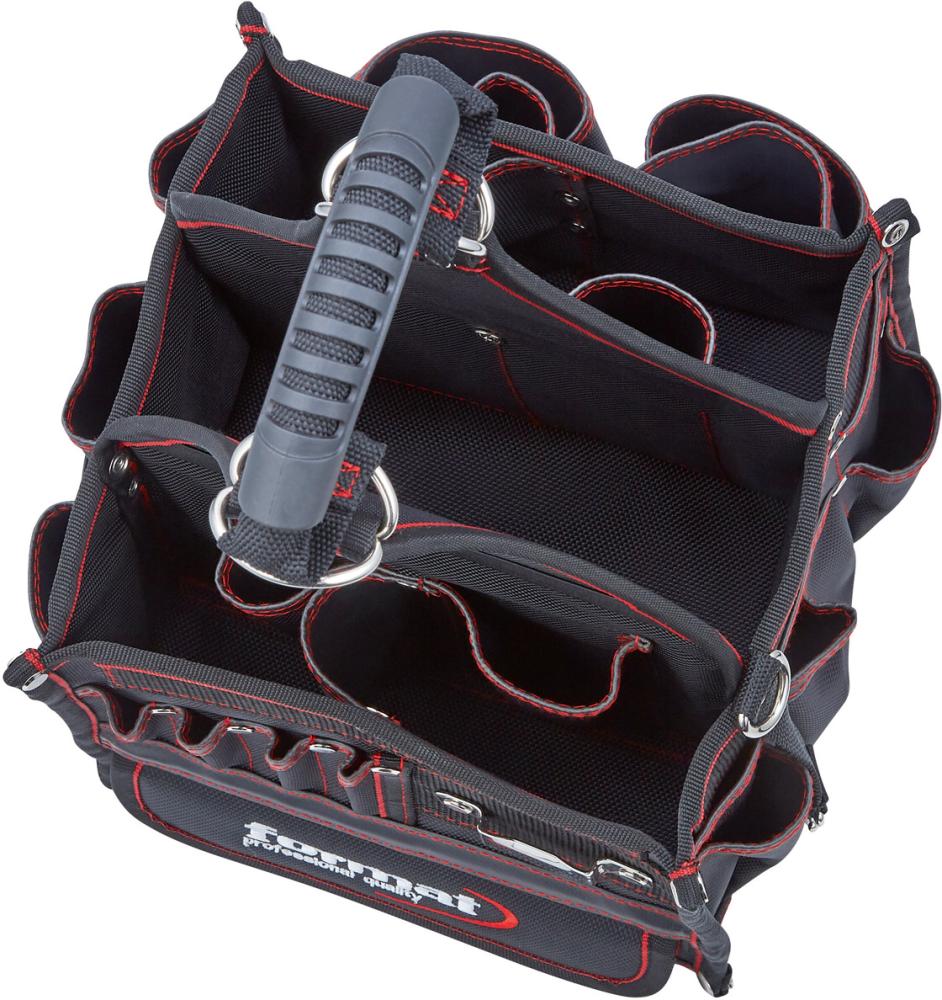 Vyhotovenie: Z ľahkej nylonovej tkaniny odolnej voči roztrhnutiu a oderu (1680 denier), čiernej farby. Vodoodpudivé, priedušné a jednoduchá údržba. Dodávka bez obsahu. S rukoväťou. Vybavenie: 27 rôzne veľkých zástrčných priehradiek 4 pridržiavacie pútka 3 oká 1 karabínka na kľúče 1 plastový box na malé diely 1 spona na zvinovací meter