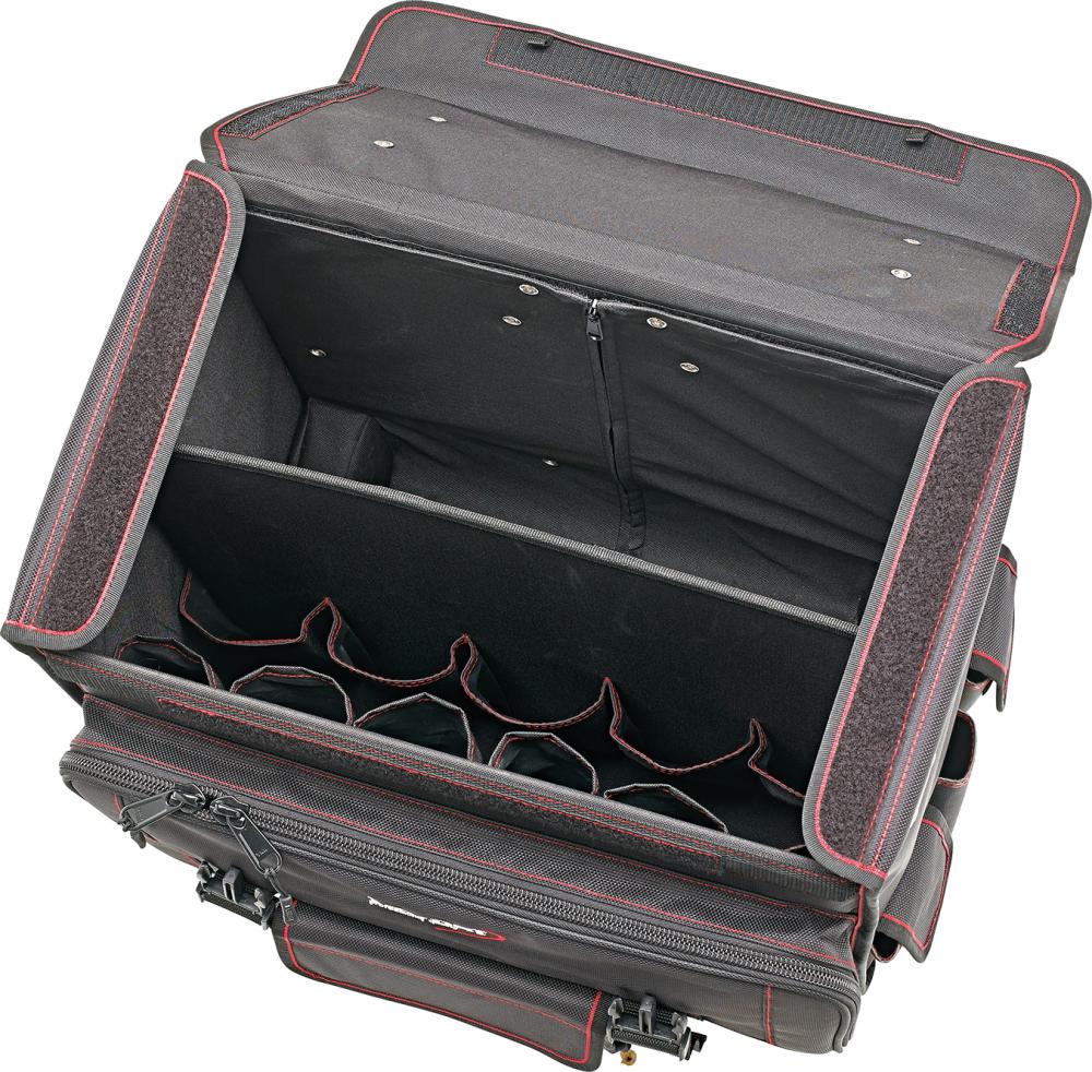 Vyhotovenie: Z ľahkej nylonovej tkaniny odolnej voči roztrhnutiu a oderu (1680 denier), čiernej farby, so zosilnenými stenami, škrupinou dna a tromi mimoriadne veľkými nožičkami. Vodoodpudivé, priedušné a jednoduchá údržba. Pevný 3-násobný teleskopický výsuv, vysúvateľný do 1 m a tri široké, profilované kolesá zaručujú jednoduchú prepravu. S polstrovanou rukoväťou. Dá sa uzavrieť pomocou pásikov na suchý zips a dvoch zasúvacích praciek. Dodávka bez obsahu. Vybavenie: 6 zástrčných priehradiek vo veľkej hlavnej priehradke 5 zástrčných priehradiek na odnímateľnej strednej stene 1 veľké predné našité vrecko so zipsom 1 polstrovaná priehradka na dokumenty, notebook atď. do veľkosti cca 400 × 35 × 280 mm 1 vnútorná priehradka so zipsom 4 vonkajšie vrecká so suchým zipsom 1 zástrčná priehradka na vonkajšej strane 1 spona na zvinovací meter