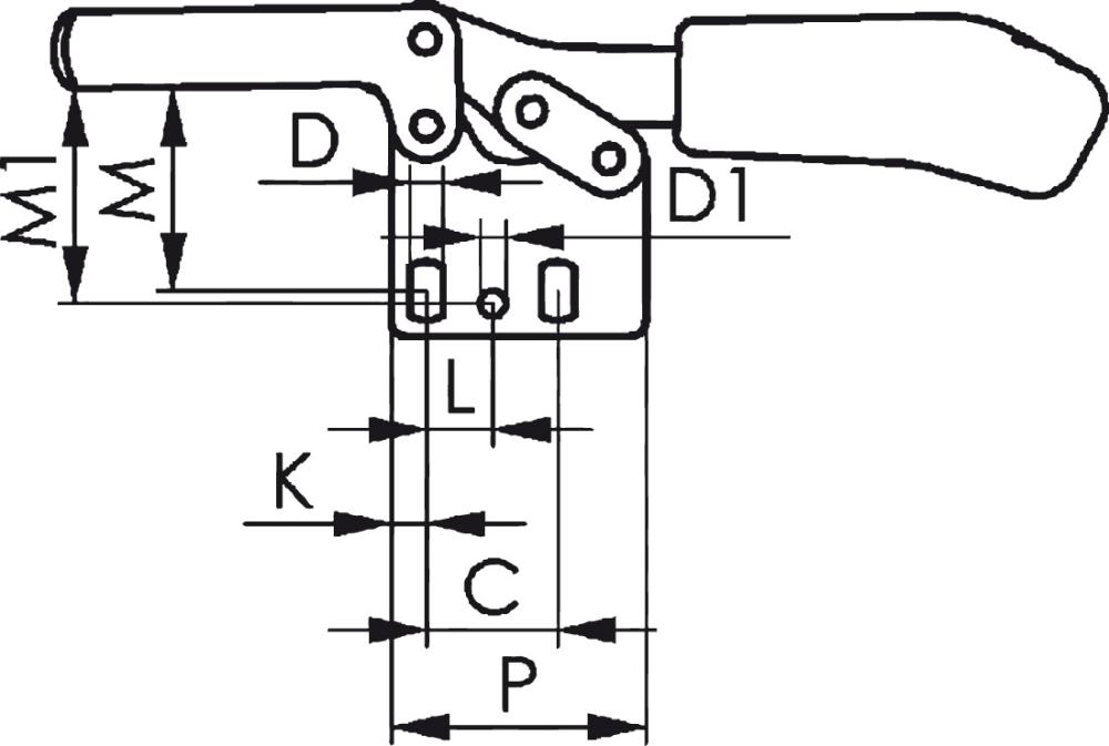 Конструкція: горизонтальний затискач з відкритим утримуючим важелем та вертикальною ніжкою. Оцинкований та пасивований. Заклепки з нержавіючої сталі знаходяться в цементованих корпусах підшипників, не для розмірів 0 та 1 через обмежений простір. Місця для підшипників змащені. Ергономічна, маслостійка ручка з великою поверхнею захоплення та м’якими компонентами. Запобіжний затискач із захистом для пальців. Пристрій запобігання втраті затискного гвинта на кінці затискного важеля.