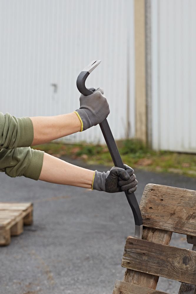Конструкція: Виготовлено із загартованої сталі зі спеціальною термічною обробкою, овально-круглий хвостовик для оптимальної передачі зусилля без згинання. Оптимізований кут підходу та кований, надзвичайно широкий підйомний важіль для передачі надзвичайно високого зусилля. Запобігає боковому коченню під заготовкою.